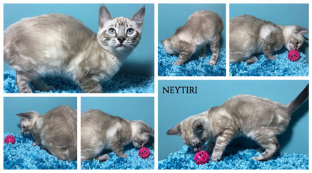 NEYTIRI (NAH-TEAR-E) is a BEAUTIFUL Seal Silver Spotted Lynx (tabby) Point Female. This girl is not only beautiful with all the characteristics that we want to see in these kittens but a big chunker. Neytiri is the deuteragonist and lead heroine in Avatar movie. We ABSOLUTELY love her silky soft glittered pelt, wide nose and calm personality. She is the second born and the only marble in this wonderful litter.