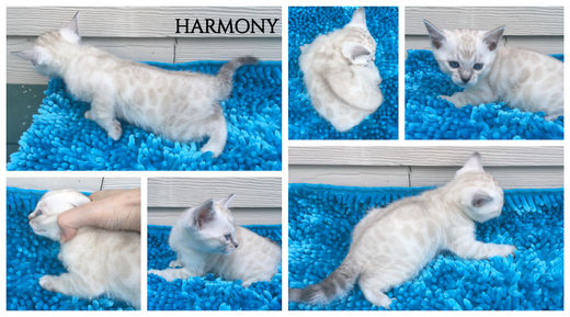 HARMONY is a BEAUTIFUL Seal Spotted Lynx (tabby) Point (possibly Seal Silver Spotted) female. She is named after the ability to Be in peace with others which continues out positive vibes theme. She is beautiful and definitely fiesty girl already. She can be identified with a yellow collar and the second born to this litter.